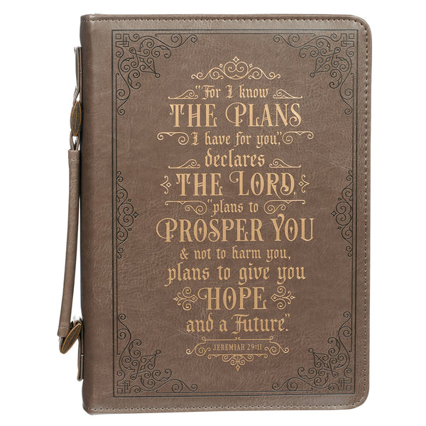 Cover your Bible in this I know the Plans Brown Faux Leather Classic Bible Cover for a convenient and fashionable way to protect your prized possession! The sentiment on the Bible cover will remind you that God has good plans for your life.